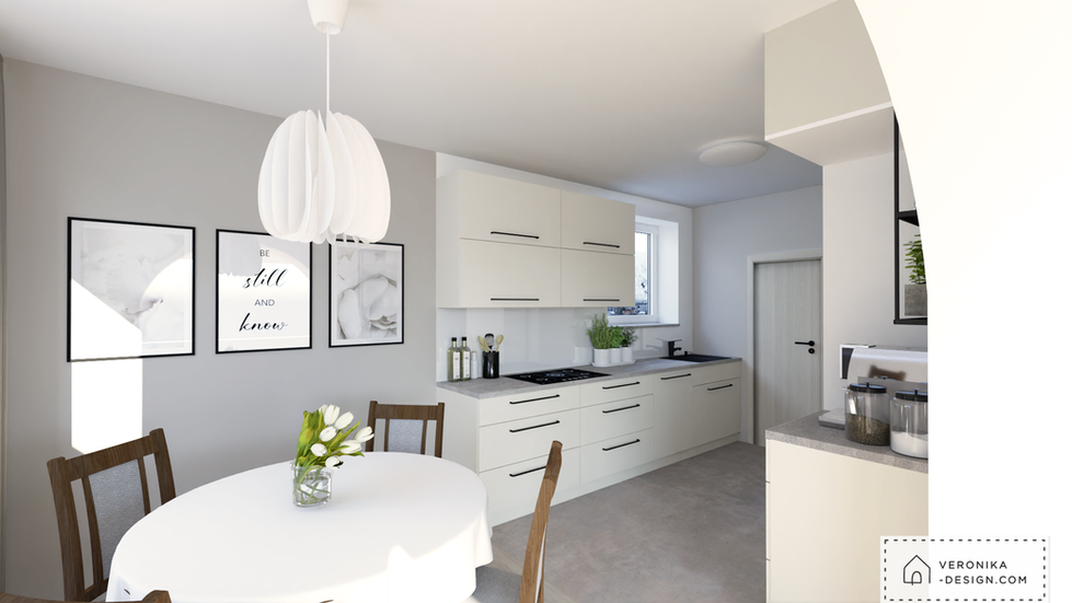 Kuchyň je průchozí a navazuje na ni jídelna a vchod do obývacího pokoje.