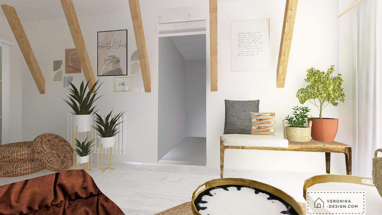 Převládá bílá a béžová barva, doplněná zemitými odstíny karamelu a metalických barev - zlaté a bronzové.